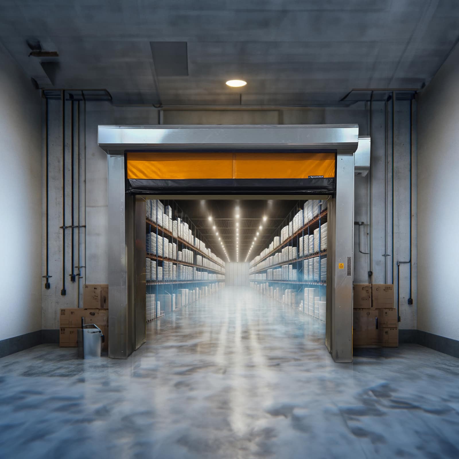 DynamicRoll Frigo1 är en självåterställande snabbrullport för kylrum som är utformad för att tillgodose behoven inom industrikylningssektorn. Den isolerade snabbrullporten är den perfekta lösningen för att undvika kallras och möjliggör snabba och säkra passager mellan olika temperaturzoner.